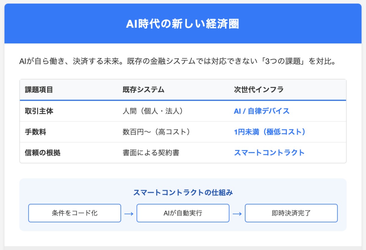 ・コストの壁: 1円以下のマイクロペイメントを繰り返すAIにとって、数百円の振込手数料は致命的なバグです。